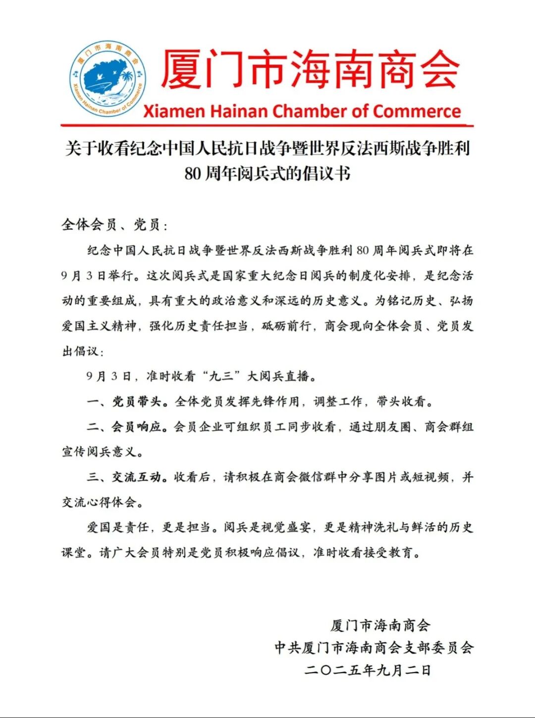 在纪念中国人民抗日战争暨世界反法西斯战争胜利80周年大会前夕,我会向全体会员特别是党员发出倡议,号召大家准时收看9月3日在北京举行的阅兵式。